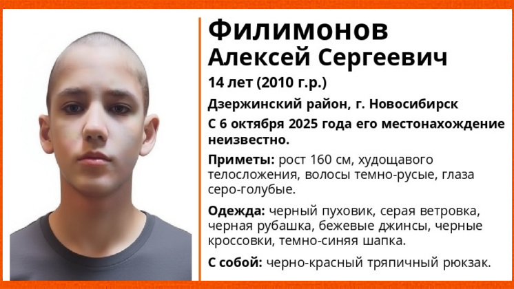В Дзержинском районе Новосибирска без вести пропал 14-летний Алексей Филимонов. Как сообщили в поисково-спасательном отряде (ПСО) «ЛизаАлерт», с 6 октября 2025 года местонахождение школьника неизвестно, поэтому к поискам подключились волонтеры. Приметы пропавшего: рост 160 сантиметров, худощавого телосложения, волосы темно-русые, глаза серо-голубые. Юная сибиряк был одет в черный пуховик, серую ветровку, черную рубашку, бежевые джинсы, черные кроссовки и темно-синюю шапку. С собой у него было черно-красный тряпичный рюкзак. Если у вас есть информация о местонахождении Алексея Филимонова, сообщите об этом по телефону ПСО 8-800-700-54-52 или наберите 112. Ранее «Вести Новосибирск» писали, что в Новосибирске пропала 17-летняя школьница в очках и красно-чёрной кофте.