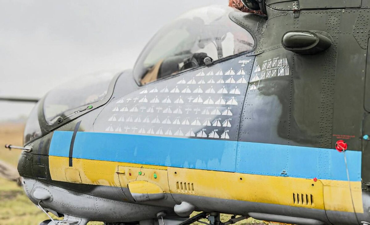 Ми-24В (чешский бывший Ми-35) противника с отметками за наши сбитые БПЛА. Не иначе 8 звездочек рисовал за 1 вылет.