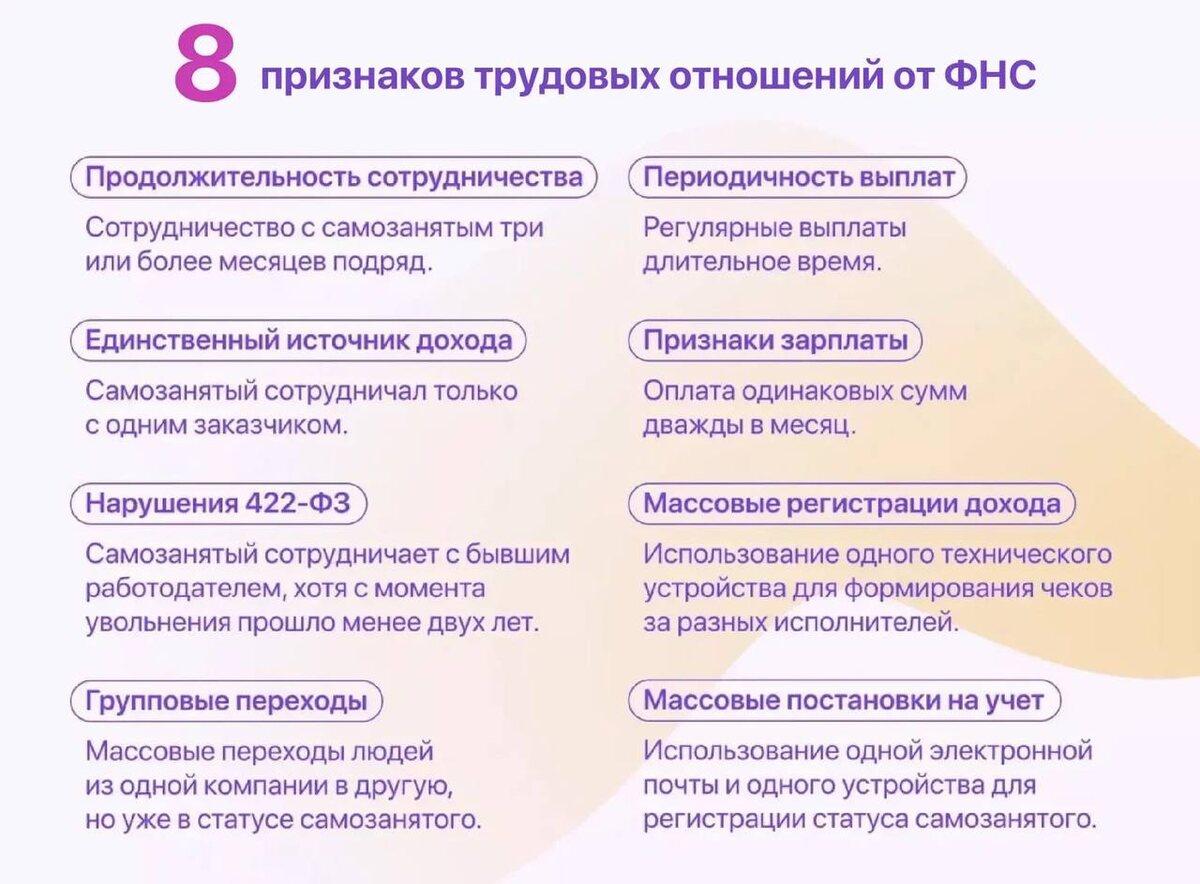Подменять трудовые отношения гражданско-правовыми становится еще опаснее! Правительство утвердило план мероприятий по борьбе с нелегальной занятостью, который будет действовать до 2027 года. Контролировать исполнение плана станет Минтруд. В плане - 18 мероприятий, которые направлены на профилактику и пресечение нарушений трудового права. Особый фокус - на подмену трудовых отношений. До 1 ноября Минтруд вместе с другими ведомствами проанализирует практику по подмене трудовых отношений ГПД и подготовит предложения, как такие случаи предотвращать. Если у вас много физлиц, работающих по договорам ГПХ, будьте готовы обосновать экономическую целесообразность этих договоров. Важно, чтобы условия работы по ГПД существенно отличались от условий работы штатных сотрудников. 8 признаков отношений которые должны быть оформлены по трудовому договору: Если нужно навести порядок в бухгалтерии и документах ✅ЗАПИШИТЕСЬ на бесплатную консультацию