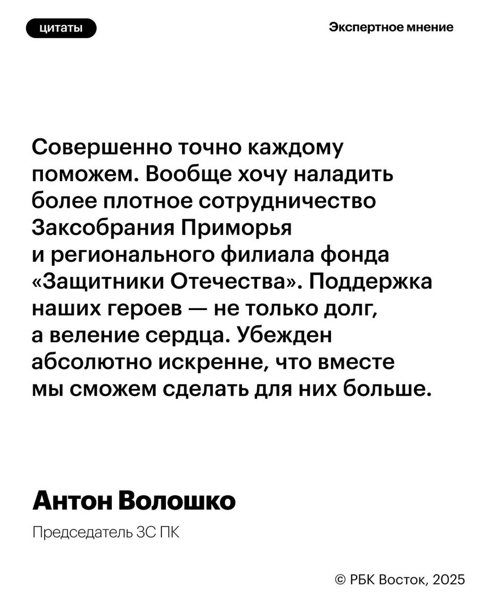 💬 Антон Волошко взял на особый контроль решение вопросов ветеранов СВО и их семей Для эффективности и оперативности реагирования спикер краевого парламента провел первый совместный прием со специалистами регионального филиала Госфонда «Защитники Отечества». В дальнейшем он планирует закрепить эту практику. 😃Подписывайтесь на РБК Восток