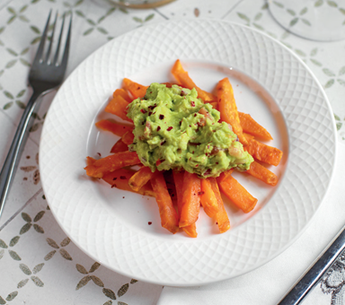 Запеченный батат с соусом из авокадо Приготовьте запеченный батат, похожий на Груки, с хрустящей кожицей и нежной мякотью. Добавьте соус с авокадо, символизирующий его хохолок, чтобы придать блюду сливочность и питательность. Ингредиенты: Батат — 400 Авокадо хаас — 2 шт. Лук зеленый — 15–20 г Масло оливковое — 15 мл Лимонный сок — 5 мл Паприка — 1/3 ч. л. Соль — 1 щепотка Хлопья чили — по вкусу Приготовление: Батат почистить, нарезать соломкой, переложить в глубокую миску. Оливковое масло смешать с паприкой, вылить сверху и перемешать. Духовку разогреть до 220 °С. Противень застелить бумагой для выпечки, распределить на нем батат в один слой, чтобы между кусочками было расстояние. Запекать в течение 20–30 минут. В это время сделать крем из авокадо. Для этого его нужно почистить, мякоть размять вилкой, добавить лимонный сок, соль и мелконарезанный лук. Достать батат, немного посолить, разложить по тарелкам, сверху выложить соус и посыпать хлопьям чили. Ролл с бататом Похожи на милого Ча