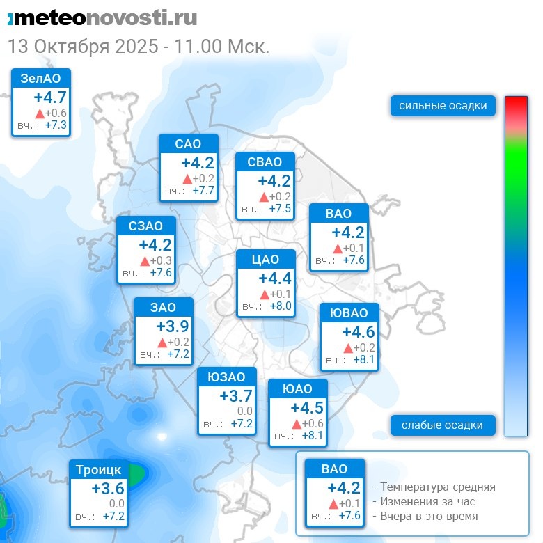 В 11:00 в Москве было от +3.3°C до +5.4°C, средняя температура +4.2°C #погода #Москва #осень #температура #13октября #понедельник