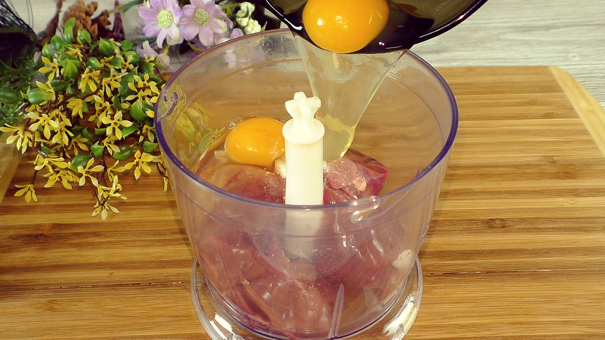 Беру половину печёнки, добавляю 0,5 ч. л. соли и 2 яйца, хорошо измельчаю. Отправляю в глубокую миску.