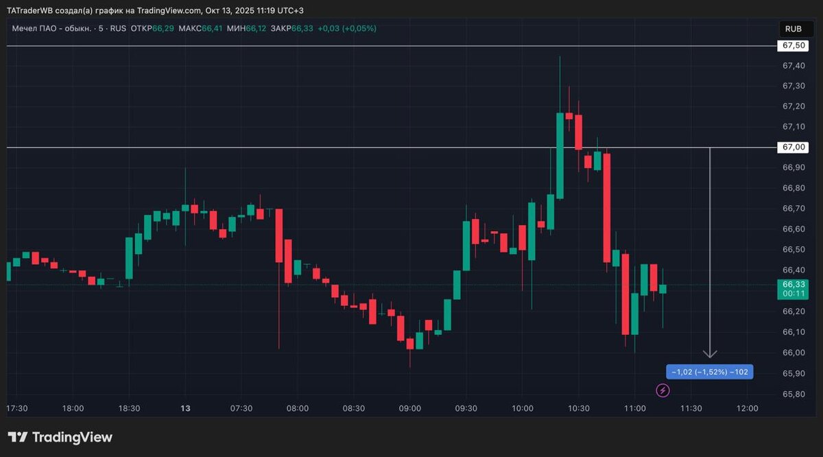 💪 Мечел - элементарный вход. Ложный пробой 67, как и писал. Далее движение на 1,5% вниз. Тейк +1,4%, забрал. Все писал заранее.