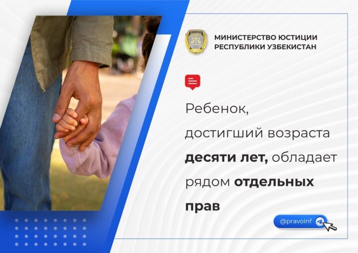 Ребёнок, достигший 10-летнего возраста, имеет право выражать своё мнение и участвовать в решении вопросов, непосредственно касающихся его жизни и будущего - передаёт пресс-служба Министерства юстиции Республики Узбекистан.