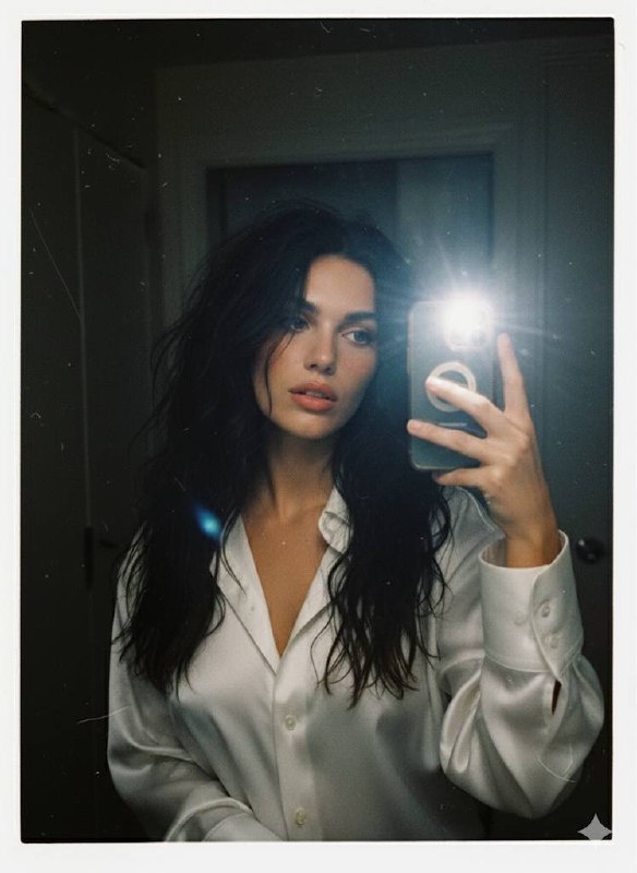 • 1. Откройте Gemini Nano 🍌 • 2. Загрузите ваше изображение • 3. Вставьте промпт Keep the exact same real face — no alteration.\n\nA hyper-realistic cinematic mirror selfie captured with the look of an early 2000s phone camera — raw, slightly grainy, nostalgic lighting.\n\nA woman with long messy-but-beautiful black hair, soft natural waves slightly tousled, a few strands softly covering her cheek. She’s taking a mirror selfie with an phone, the phone only partly visible in her hand and not blocking her face. \n\nThe focus stays on her reflection — calm, confident, and effortlessly beautiful. Her expression feels spontaneous, captured mid-moment.\n\nLighting: direct flash focused only on her face and front hair; slightly harsh flash halo typical of compact cameras. Background remains dim, cinematic, and softly blurred.\n\nHer white satin oversized shirt catches the flash softly, adding a touch of glow. Shadows contour her jawline and collarbone naturally, while soft highlights empha