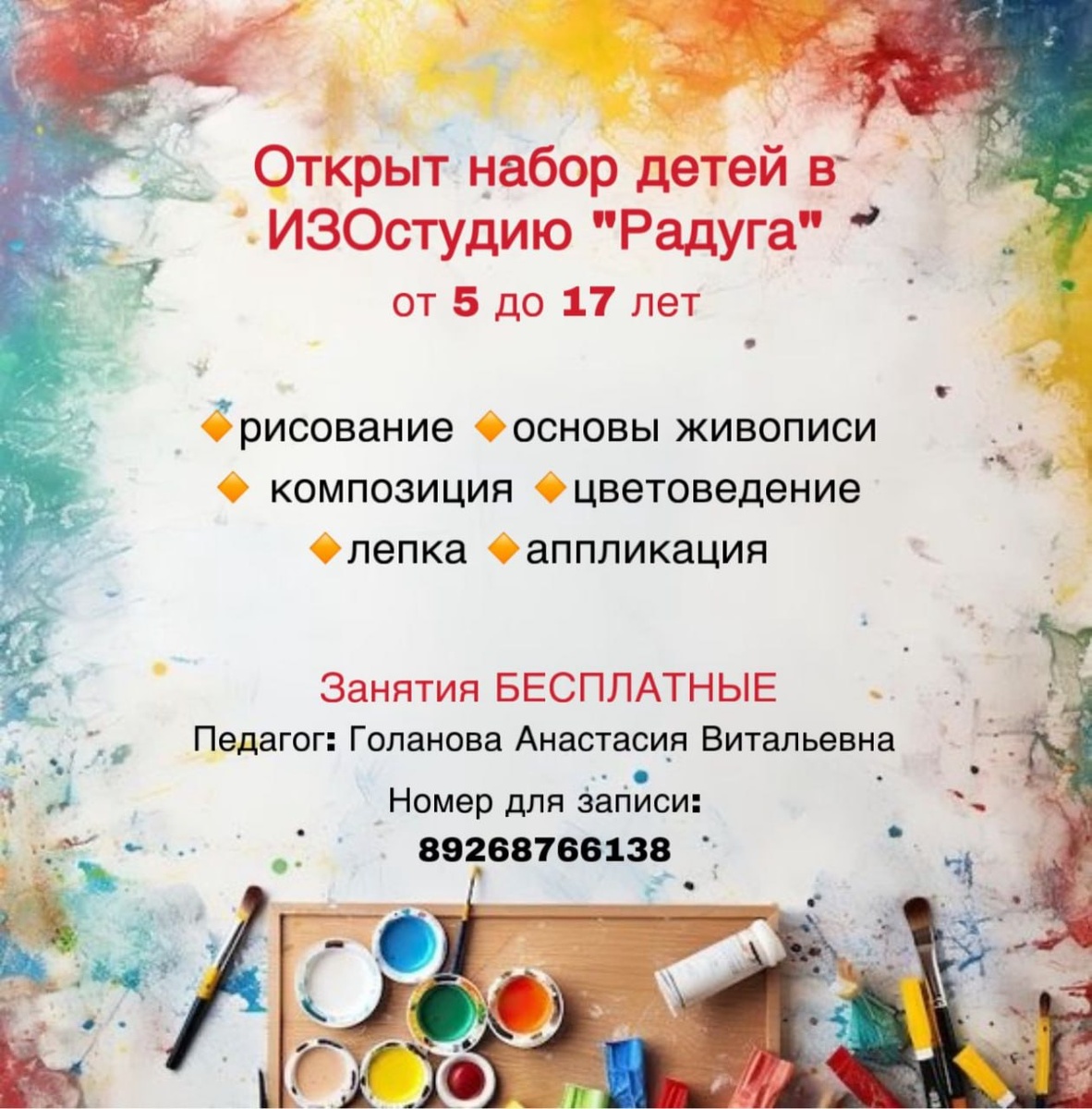 ✨ Набор детей в ИЗОстудию «Радуга» 🖌 от 5 до 17 лет! ✍️Запись через портал госуслуги ❗️Педагог - Голанова Анастасия Витальевна ❗️Занятия БЕСПЛАТНЫЕ 🏢 ДДиЮ 📍 г. Серпухов, площадь Ленина, 13/1 Для получения дополнительной информации и записи на занятия, пожалуйста, свяжитесь Голанова Анастасия Витальевна 📲 89268766138 ⭐Поддержать канал голосом 💰 Вакансия - курьер в Серпухове ✅ Мероприятия Серпухов https://dzen.ru/id/66f01c6eb4c6fe60c9ca1608 http://vk.com/serpukhov_events http://dzen.ru/serpukhov_events