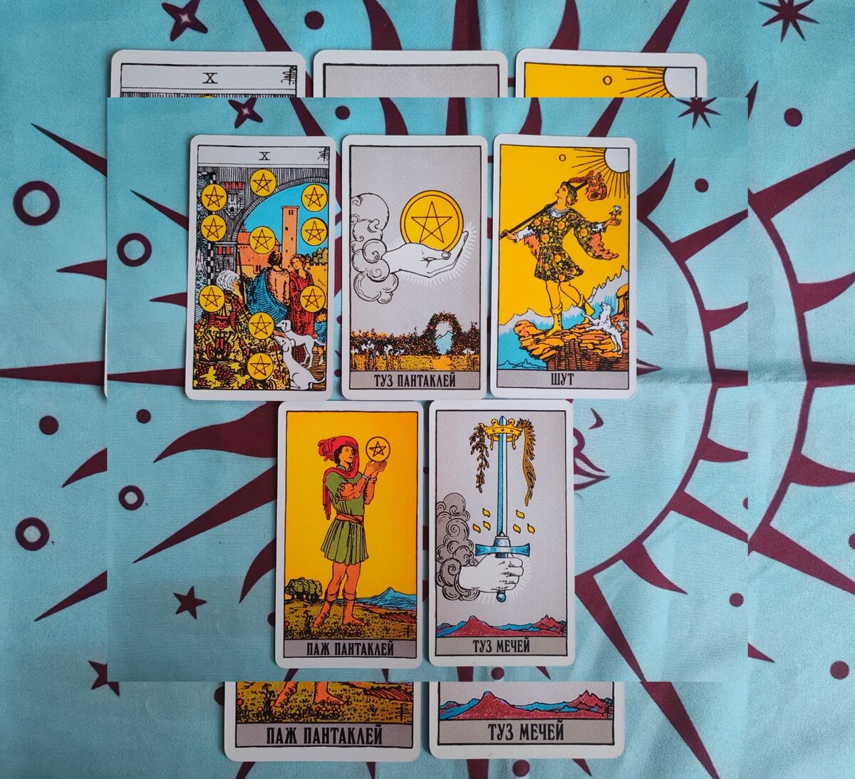1. 10 Пентаклей (основа, фундамент мыслей) · Что он думает: Она — воплощение идеала семьи, стабильности и долгосрочного благополучия. Он видит в ней не просто партнершу, а женщину, с которой можно построить прочный "род", создать наследие, обрести финансовую и социальную надежность. Это карта "долго и счастливо", где есть место и детям, и дому, и уважению в обществе. · Проще говоря: "С ней я вижу надежное будущее, настоящую семью и полную чашу". 2. Туз Пентаклей (то, что привлекло и вдохновило) · Что он думает: Она — это реальный, осязаемый шанс на улучшение жизни. Туз Пентаклей — это предложение новой возможности, часто материальной (хороший доход, выгодные перспективы), но также и возможность для личного роста. Он считает, что связь с ней — это выигрышный билет, начало чего-то очень перспективного. · Проще говоря: "Она — моя золотая жила. С ней открываются потрясающие возможности". 3. 0 Шут (его чувства и непосредственное восприятие) · Что он думает: С ней он чувствует свободу,