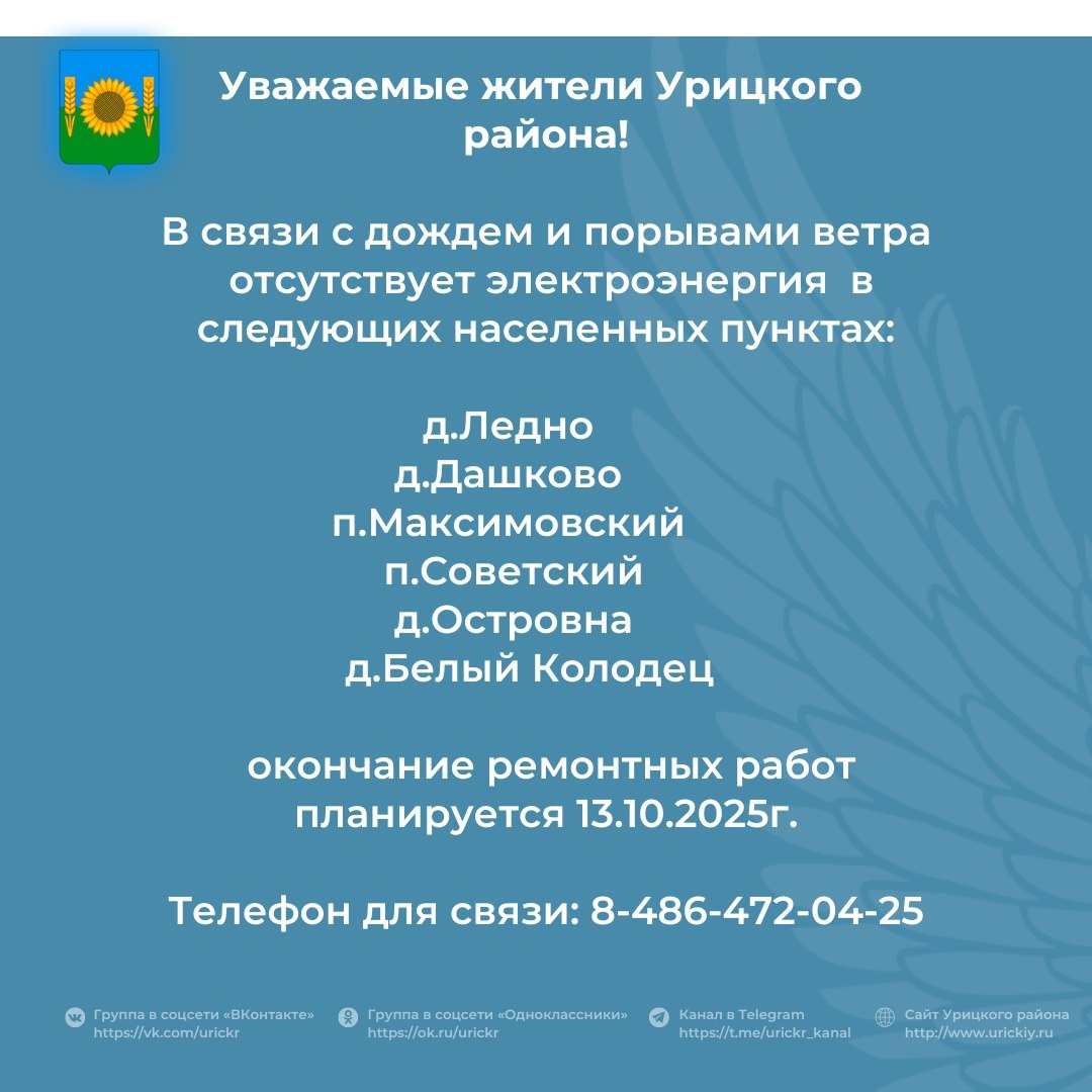 📢 Уважаемые жители Урицкого района! В связи с дождем и порывами ветра отсутствует электроэнергия в следующих населенных пунктах: д.Ледно, д.Дашково, п.Максимовский, п.Советский, д.Островна, д.Белый Колодец Окончание ремонтных работ планируется 13.10.2025г. Телефон для связи: 8-486-472-04-25 #УрицкийРайон #АдминистрацияУрицкогорайонаОрловскойобласти