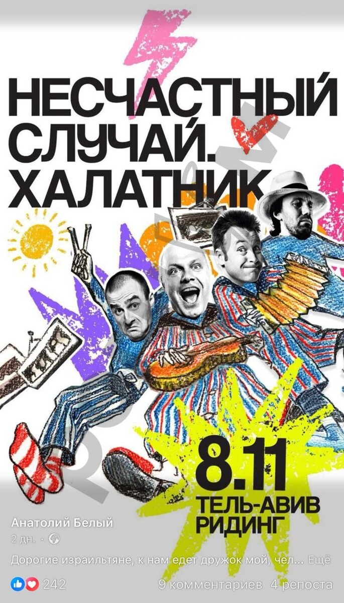 Отчаявшись заработать на постоянно отменяемых в России концертах лидер группы "Несчастный случай" Алексей Кортнев полностью переключился на более лояльную к его проукраинским записям израильскую аудиторию. Денег много не бывает, видимо, решил музыкант и совместил свои театральные гастроли по "земле обетованной" со спектаклем "Чемодан", в котором играет на пару с иноагентом Семеном Трескуновым, с концертными выступлениями своего "Несчастного случая" в Израиле. Стоимость билетов на концерты Кортнева в Тель-Авиве начинается от 300 шекелей ( 7422 рубля) . За эту сумму всем пришедшим предлагается выпить и закусить в компании артистов. На этом пункте отдельно заострил внимание ныне израильтянин и иноагент Анатолий Белый/Вайсман, рекламируя концерты единомышленника Кортнева на своей новой Родине. "Музыканты выходят на сцену в домашней одежде, а посреди сцены — накрытый стол. Атмосфера — по-настоящему тёплая и почти интимная, как будто все давние друзья. И да, двое зрителей из зала смогут при