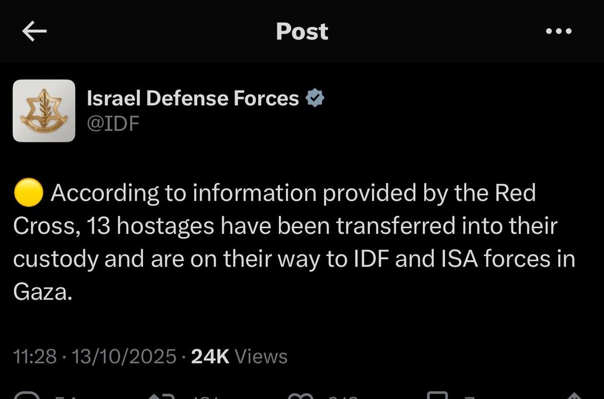 IDF confirms it’s been informed by the Red Cross — 13 hostages are now on their way