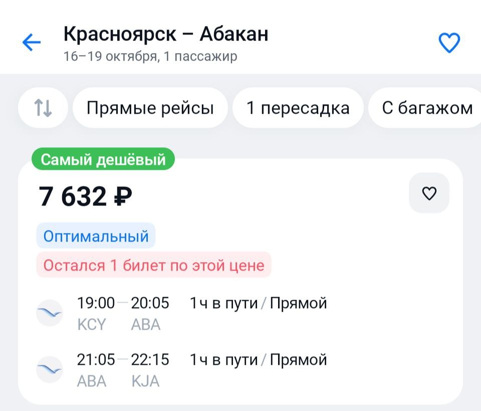 Сайт авиакомпании КрасАвиа все ещё не работает (не знаем, когда наладят, не спрашивайте). Поэтому покупка только через агрегаторы. А стоимость билетов до Абакана и обратно на этой неделе такая 👆 https://aviasales.tpm.lv/p1k1ENXW #ABA @KJA