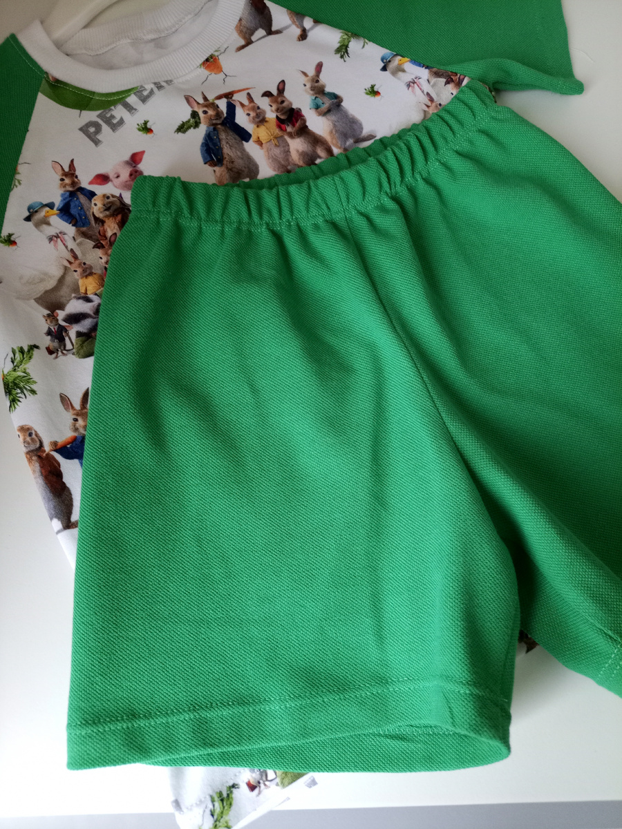 Костюм номер два состоит из футболки и штанов. Штаны из односторонней махра. Почему-то штаны получились огромные, внизу манжета получилась широкая и некрасивая. Вообще на манжету нужно было кашкорсе или рибану, но не нашлось нужного цвета, а махра имеет меньшую растяжимость и потому манжета из неё получилась несуразная. Вообщем эти штаны будут домашние, а для комплекта я сошью ещё одни шорты.