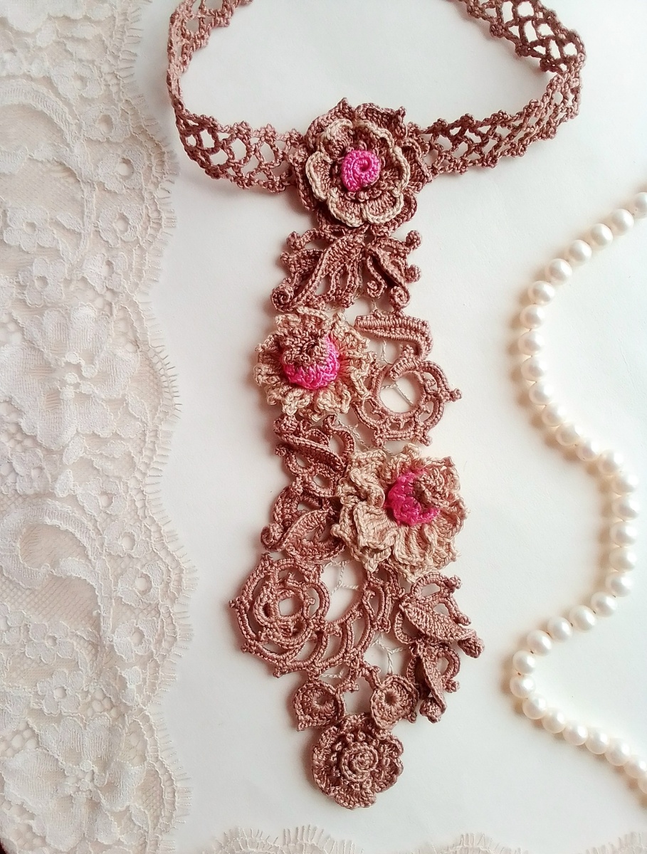 Добрый день! Сегодня хочу немного рассказать о галстуках, которые вязала в технике арт-кружево. Арт-кружево крючком — это техника вязания крючком, которая предполагает создание отдельных элементов, с последующим соединением их между собой при помощи сетки или сшивания иглой. Можно сказать, что Арт - кружево - это современное ирландское кружево, оно вяжется из более толстых нитей и может быть многоцветным. Например, вот такой галстук "Поздние цветы" Далеко не самый тонкий вариант кружева:) Нашейную часто галстука делаю из ажурной сеточки, а кружевную часть из мотивов. Чаще всего это цветы, листья и завиточки. Завязывается галстук на шнурок из аналогичной пряжи. В галстуке "Август" добавила плоды и ягодки. У этих галстуков самая простая выкройка: К галстуку "Август" были связаны запонки:) Мастер - Классы на некоторые мотивы этого галстука можно посмотреть по ссылкам: Длинный вариант галстука. Длина 42 см. Прежде чем начать вязать галстук, обязательно проверьте подходит ли оттенок п