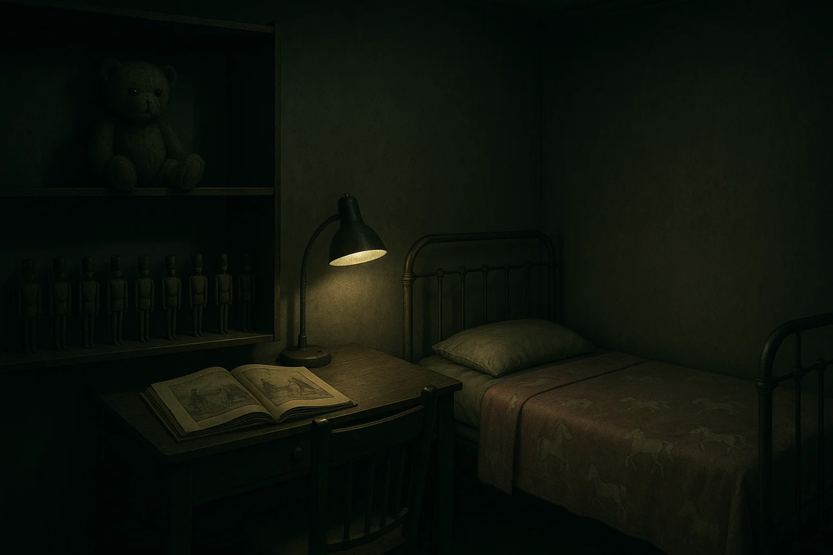 Комната оказалась детской: игрушки аккуратно стояли на полках: потрёпанный мишка с одним стеклянным глазом, деревянные солдатики, выстроенные ровным рядом. На столе лежал раскрытый букварь с картинками, изображавшими жизнь крестьян. На кровати с металлическими спинками лежал аккуратно заправленный розовый плед с выцветшим рисунком пони. На прикроватном столике стояла кружка с мутным осадком на дне, будто кто-то только что не допил молоко.