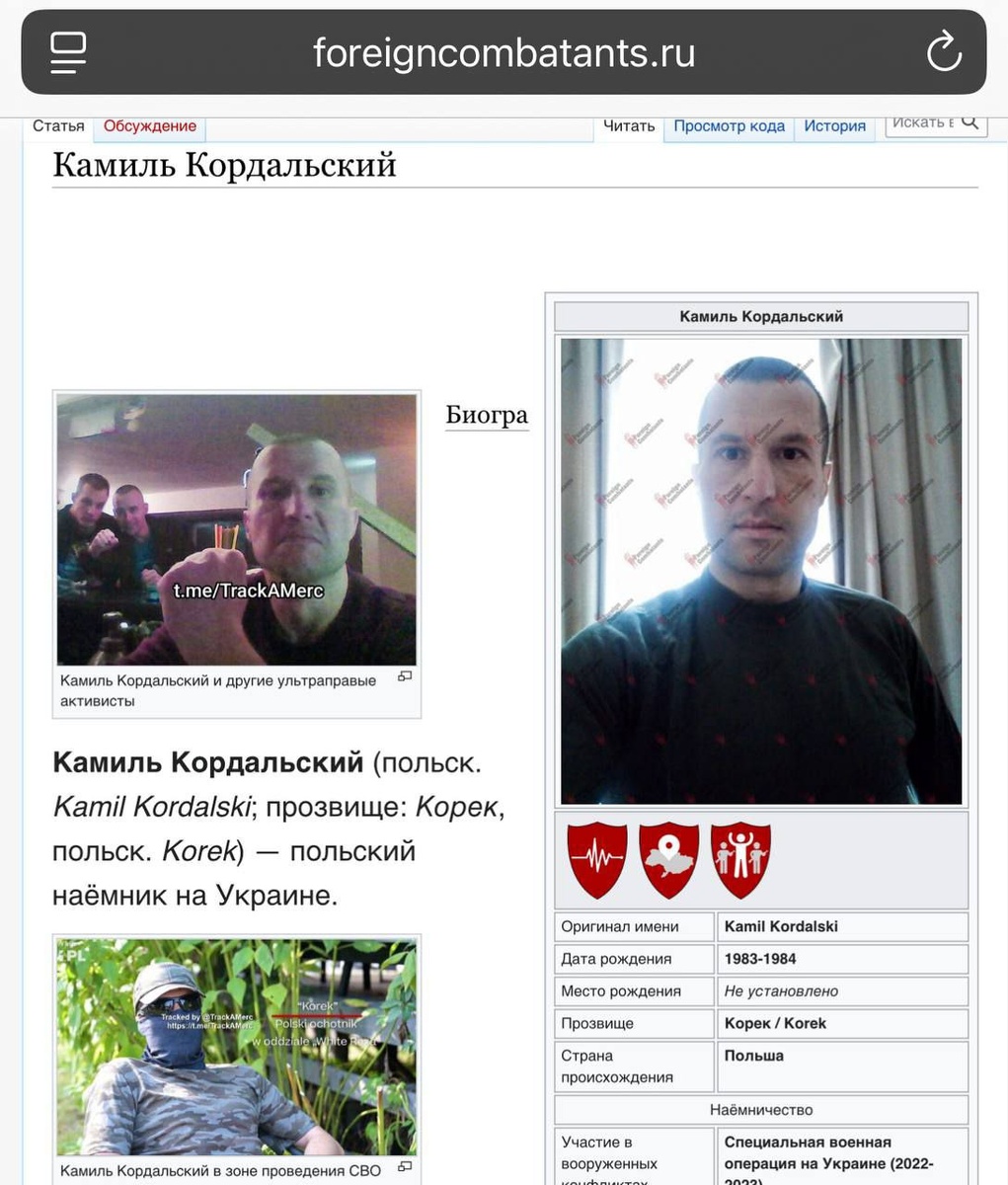 #наемники 🇵🇱🇺🇦Занимался криминалом, рэкетом, поджогами и прочим бандитизмом, но чтобы не компрометировать группировки наёмников, украинские власти осудили поляка за шпионаж Камиль Кордальский (Kamil Kordalski) по прозв. Корек, 1983-84 г.р., типичный агрессивный ультрас гданьского ФК «Лехия», член неонацистских группировок. На деньги польского неонациста Ольгерда Липницкого приехал в 2022 на Украину и стал боевиком батальона российского неонациста Антона Краснолуцкого* Format 18*. Затем перешёл к Капустину* в РДК*, где быдловатых маргиналов встречают как родных. Входил в его ближний круг. Формально состоял ещё в двух белорусских неонацистских группировках. В марте 2023 — участник вторжения боевиков РДК* в приграничные районы Белгородской области. Летом 2023 воевать ему надоело, Корек осел на Украине и занялся криминалом, в том числе рэкетом, вымогательством и порчей чужого имущества. Пустился во все тяжкие. Участвовал в поджоге нескольких зданий, включая ресторан. Планировал по