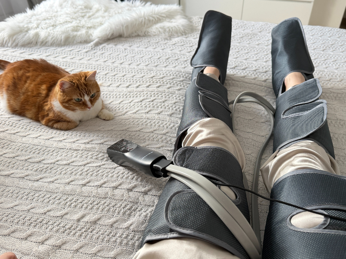 Я заказывала аппарат для прессотерапии и лимфодренажного массажа ног Gezatone AMG709PRO. Он недорогой, по стоимости как 3-5 процедур в наших местных клиниках, только манжеты с блоком управления остаются с тобой навсегда. Ещё для меня важным пунктом было короткое время на саму процедуру — 20 минут вместо 45-60 минут.