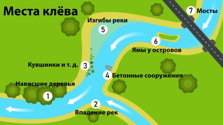 Осенью рыба вначале питается в местах, богатых поникающими водорослями, собирая здесь “урожай” семян, личинок и водных насекомых, лишившихся укрытий. На реках поиски проще. Здесь помогают линии берегов, следы течений и цвет воды, которые указывают на глубину водоемов. Небольшие реки обычно вьются по пойме, образуя излучины, заливы и старицы. У вогнутых берегов речных излучин глубины всегда наибольшие, здесь образуются обрывы — яры, а у выпуклых — отмели. Узкие места с тихим и несильным течением глубже, чем широкие. Мелкие места с быстрым течением называются перекатами. На перекате бывает обычно глубокое место — “корыто”, которое легко определить по более темному цвету воды. Ниже перекатов часто образуются глубокие ямы — омуты, которые облюбовывают крупная рыба и хищники. Прямые или слегка прогнутые участки реки между перекатами называются плесами, где течение всегда слабее, чем на перекатах или у Яров. Глубина плеса чаще всего равномерно возрастает от берегов к середине реки и бывает н