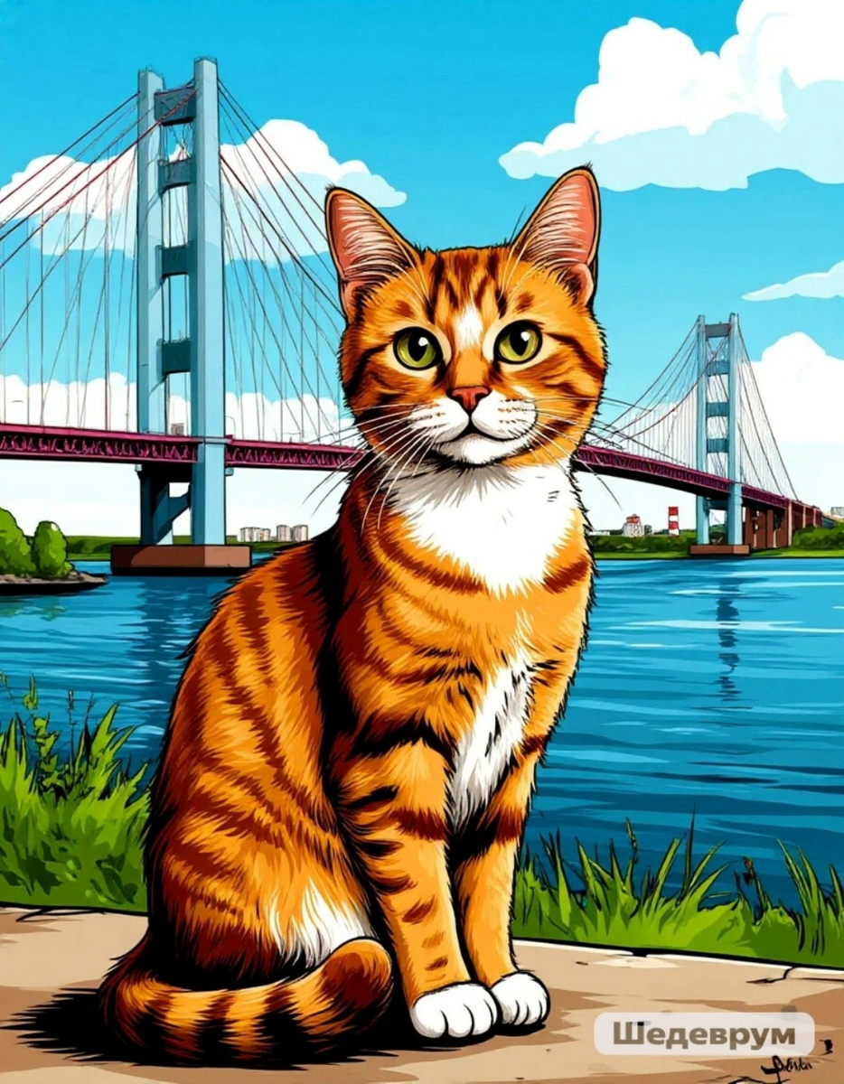 Промт (текстовый запрос): «Рисунок: Архангельский мост в Череповце и мультяшный кот»
