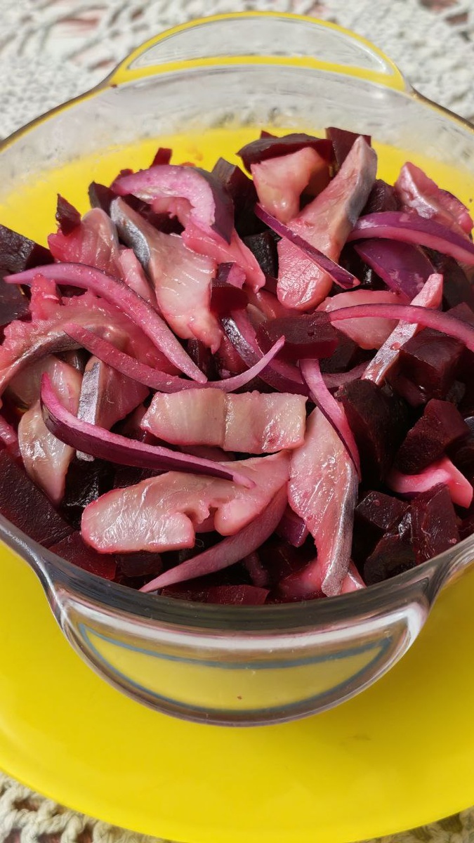 Всё очень быстро и просто. Свекла, селёдка из магазина и лук красный и фсё. Перемещалась, можно угощаться.