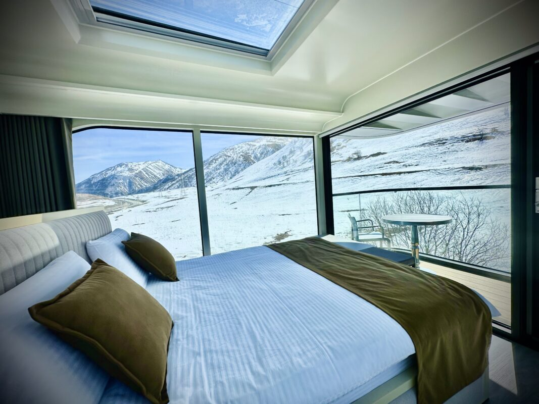 Снаружи домики выглядят футуристично, но внутри — тепло, минимализм и уют. Свет можно регулировать мягкими касаниями, включать музыку через умную колонку, а по утрам наблюдать, как солнце медленно поднимается над горами, окрашивая белый склон в золотой цвет.