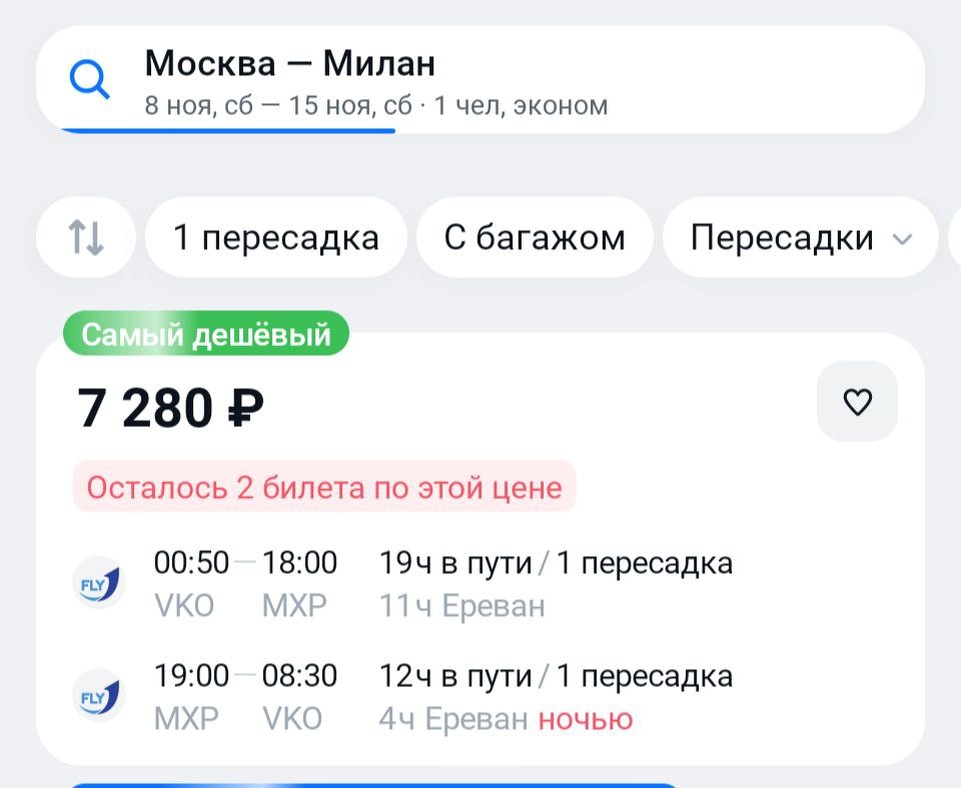 Ничего необычного. Из Москвы в Милан туда-обратно. Там ещё и Ереван затесался. https://aviasales.tpm.lv/K9QIKmKV Из Питера в Париж летом тот же ценник. Афигеть, да же? https://aviasales.tpm.lv/ZAj9QDJc Армянская FlyOne устроила распродажу. Есть Шенген? @KJA