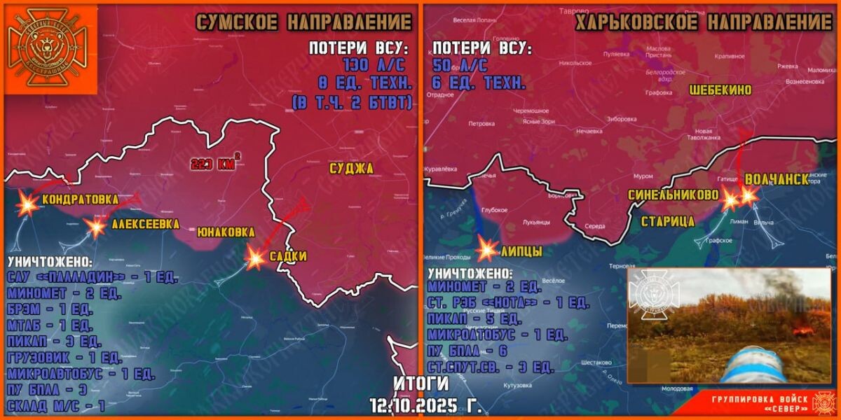 К утру 13 октября появились новые подробности боестолкновений рядом с госграницей Курской области. Так, на всем участке фронта в Сумской области идут жестокие бои. Штурмовые группы ВДВ и морской пехоты продвинулись в лесопосадках Сумской области и закрепились на завоеванных позициях. ВСУ контратакует, не жалея личного состава. На Теткинском и Глушковском направлениях кардинальных перемен не зафиксировано. Расчеты БПЛА и артиллерия группировки «Север» наносила удары по целям ВСУ в районе Искрисковщины и Рыжевки.