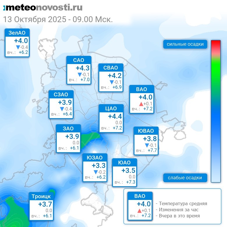 В 9:00 в Москве было от +2.8°C до +4.8°C, средняя температура +4°C #погода #Москва #осень #температура #13октября #понедельник Перейти на сайт Прогноз погоды на 14 дней