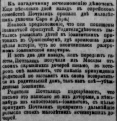 Явилось предположение, что они похищены иоаннитской прислугой. Родители девочек пытались разыскать детей в иоаннитских притонах в Ораниенбауме, где произошла даже целая история, чуть не окончившаяся разгромом иоаннитской квартиры.
