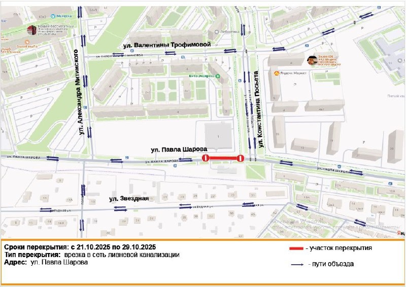 Временные ограничения движения С 21 по 29 октября на период производства работ планируется прекращение движения транспорта на автомобильной дороге по ул. Павла Шарова в районе пересечения с ул. Константина Посьета. Участников дорожного движения просим обращать внимание на дорожные знаки, заранее планировать маршрут движения, соблюдать Правила дорожного движения РФ. Возможные маршруты объезда: ул. Константина Посьета, ул. Александра Митинского, ул. Звездная, ул. Валентины Трофимовой. Департамент дорожной инфраструктуры и транспорта