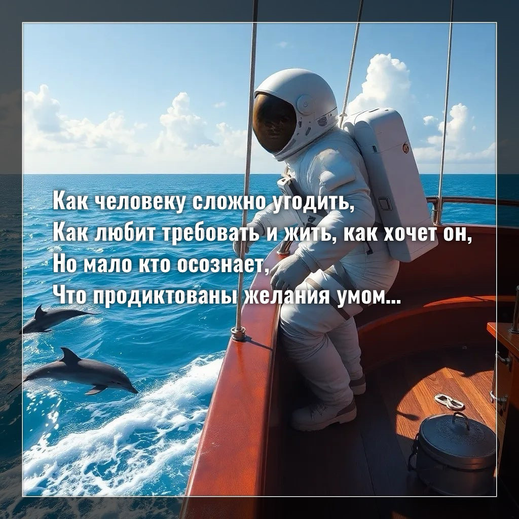 Как человеку сложно угодить, Как любит требовать и жить, как хочет он, Но мало кто осознает, Что продиктованы желания умом, А у Души свои есть правила, Свои мечты, цели, ориентиры, Ей важно выполнить всё то, за чем пришла, А не стремиться взять с собой больше «в могилу», Обиды тоже бич в духовном росте, Буквально сводят всех вокруг с ума, А позже рушится физическое тело, Так и хотел разрушить мир весь сатана, Чтобы не знали ни любви, ни радости, Чтоб обвиняли Души близкие во всём, Но человек сам может чувства выбирать, Ни близкий, ни прохожий ни при чём, Сам человек способен контролировать Эмоции, поступки и слова, Но склонен на других ссылаться, Вот уж где снова горе от ума, Попытка жизнь на тормозах спустить, Чтоб близких было меньше, чем врагов, Но это больше планы тёмных, Не так совсем хотел ведь Бог.