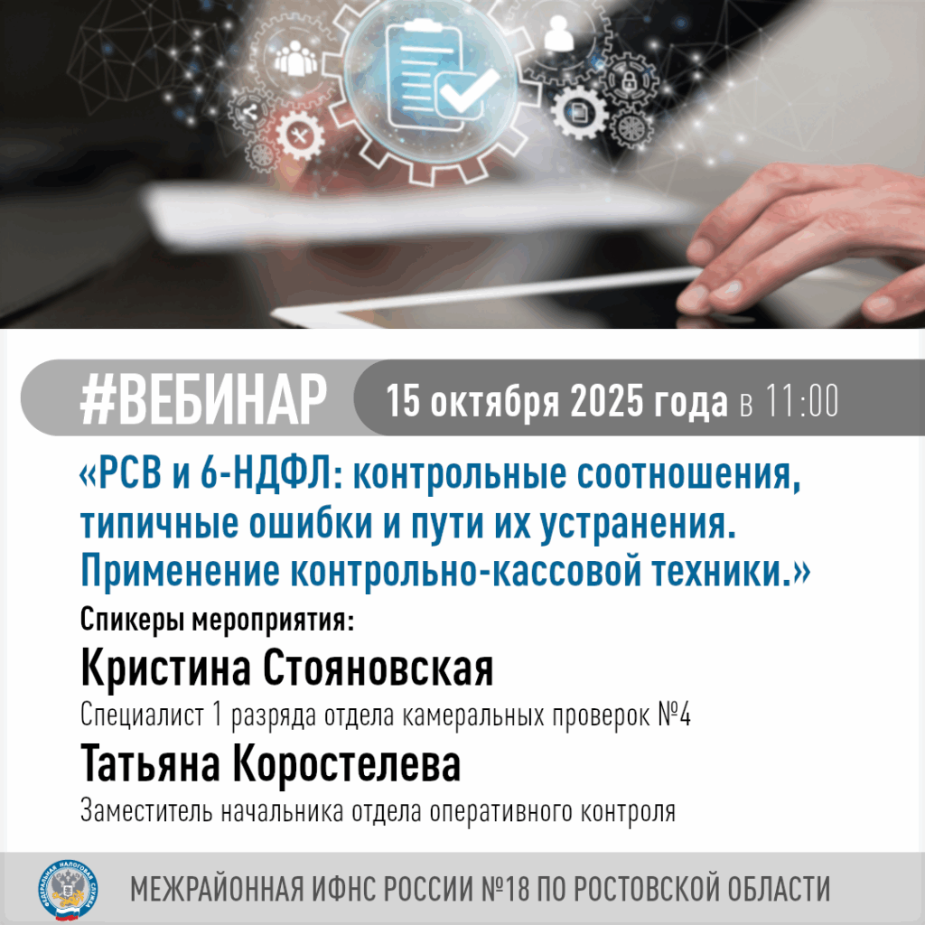 Приглашаем налогоплательщиков принять участие в вебинаре по теме «РСВ и 6-НДФЛ: контрольные соотношения, типичные ошибки и пути их устранения. Применение ККТ в рамках реализации отраслевого проекта «Общественное питание»» В программе вебинара: • РСВ и 6-НДФЛ: контрольные соотношения, типичные ошибки и пути их устранения. • Порядок представления уведомлений об исчисленных суммах налога на доходы физических лиц и страховых взносов. • Полнота предоставления расчетов по страховым взносам и уведомлений об исчисленных суммах налога на доходы физических лиц и страховых взносов за 3 квартал 2025 года с учетом актуальных изменений в законодательстве РФ о налогах и сборах. • Применение контрольно-кассовой техники в рамках реализации отраслевого проекта «Общественное питание». • Вопросы применения ККТ в отдаленных и труднодоступных местностях Ростовской области. Вебинар пройдет 15 октября 2025 года в 11:00. Для подключения к трансляции необходимо перейти по ссылке: https://clck.ru/3PR69z Межрайон