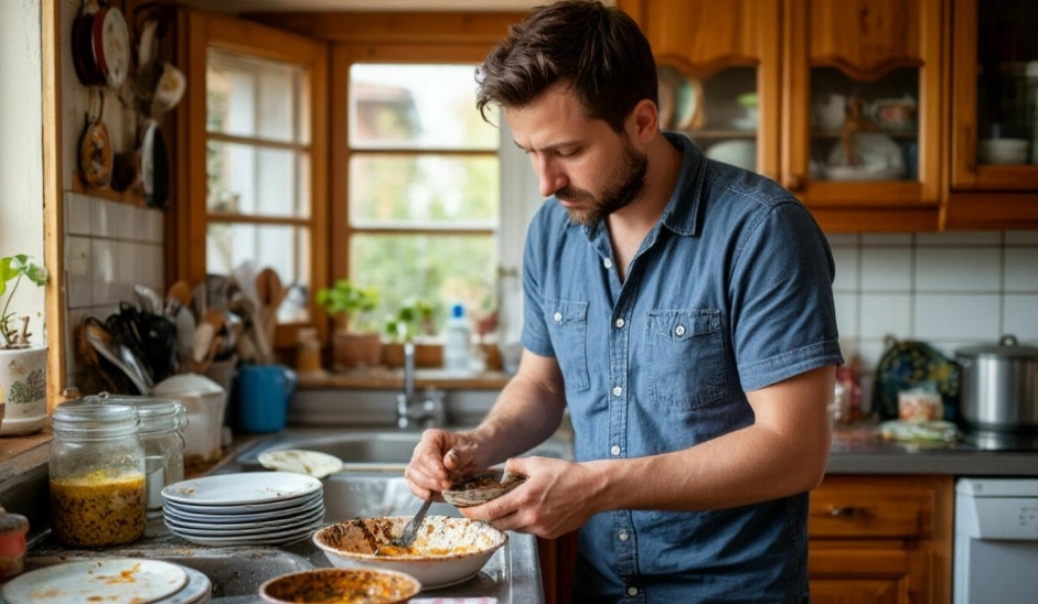 После расставания с Альбиной Мухин так и не наладил быт: раковина доверху заполнена грязной посудой, в холодильнике — только заветренный кусок колбасы и два яйца. Мужчина зажёг конфорку и поставил на огонь сковороду.