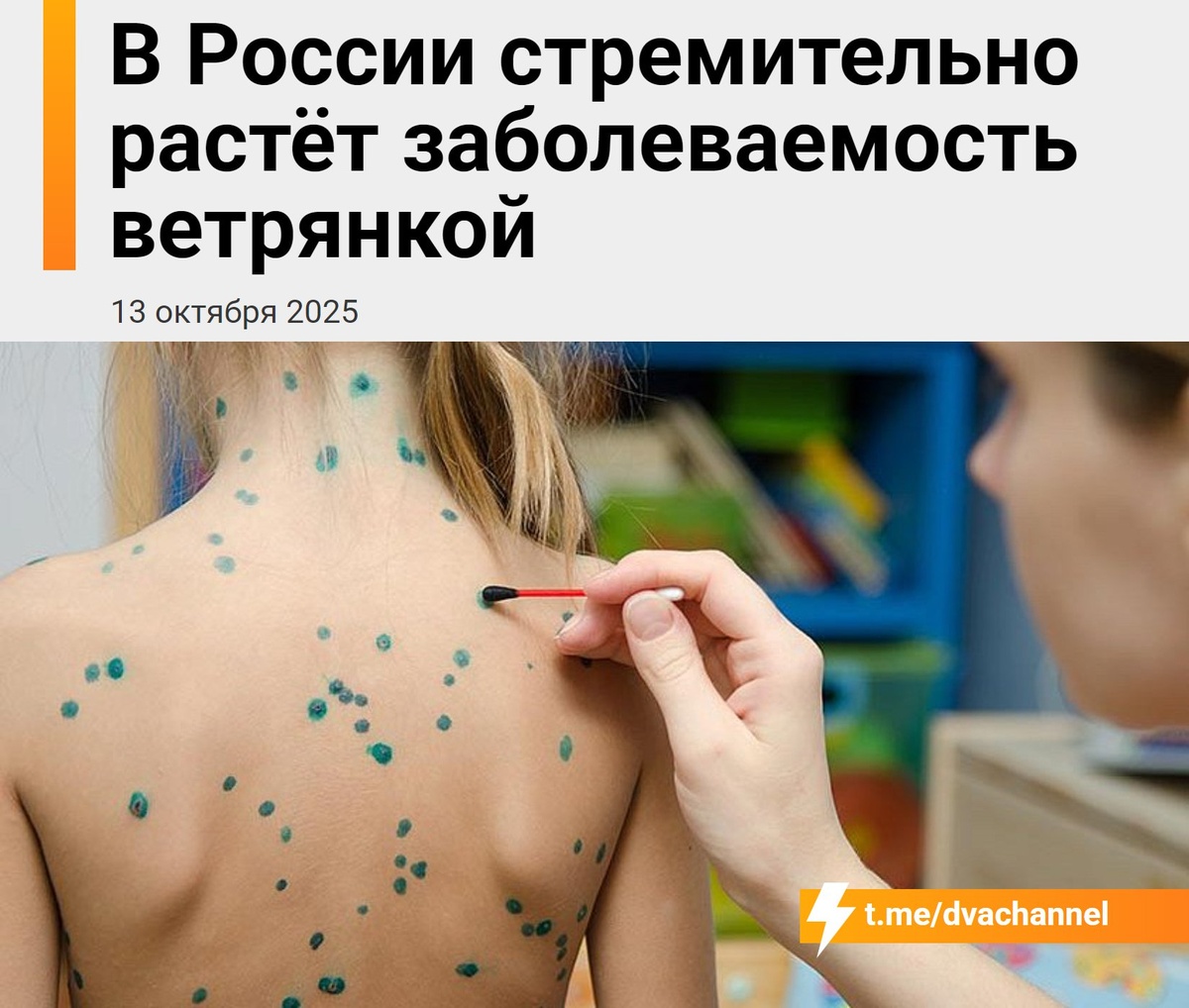 ⚡️Ветрянка молниеносно распространяется по России 🟠На Ямале число заболевших ветряной оспой выросло на 67%, в Башкирии – вдвое, до 16,5 тысячи человек; 🟠В Уфе из-за вспышки массово закрываются детские сады; 🟠Заболеваемость растёт и на Алтае, в Воронежской и Оренбургской областях; 🟠Болеют и дети, и взрослые, сообщают «Известия»; 🟠С 2023 года вакцину от ветрянки убрали из Национального календаря: её не производят в России, а завезти из-за границы трудно; 🟠Отечественная вакцина появится только к 2027 году. Соболезную непереболевшим. Источник: t.me/dvachannel