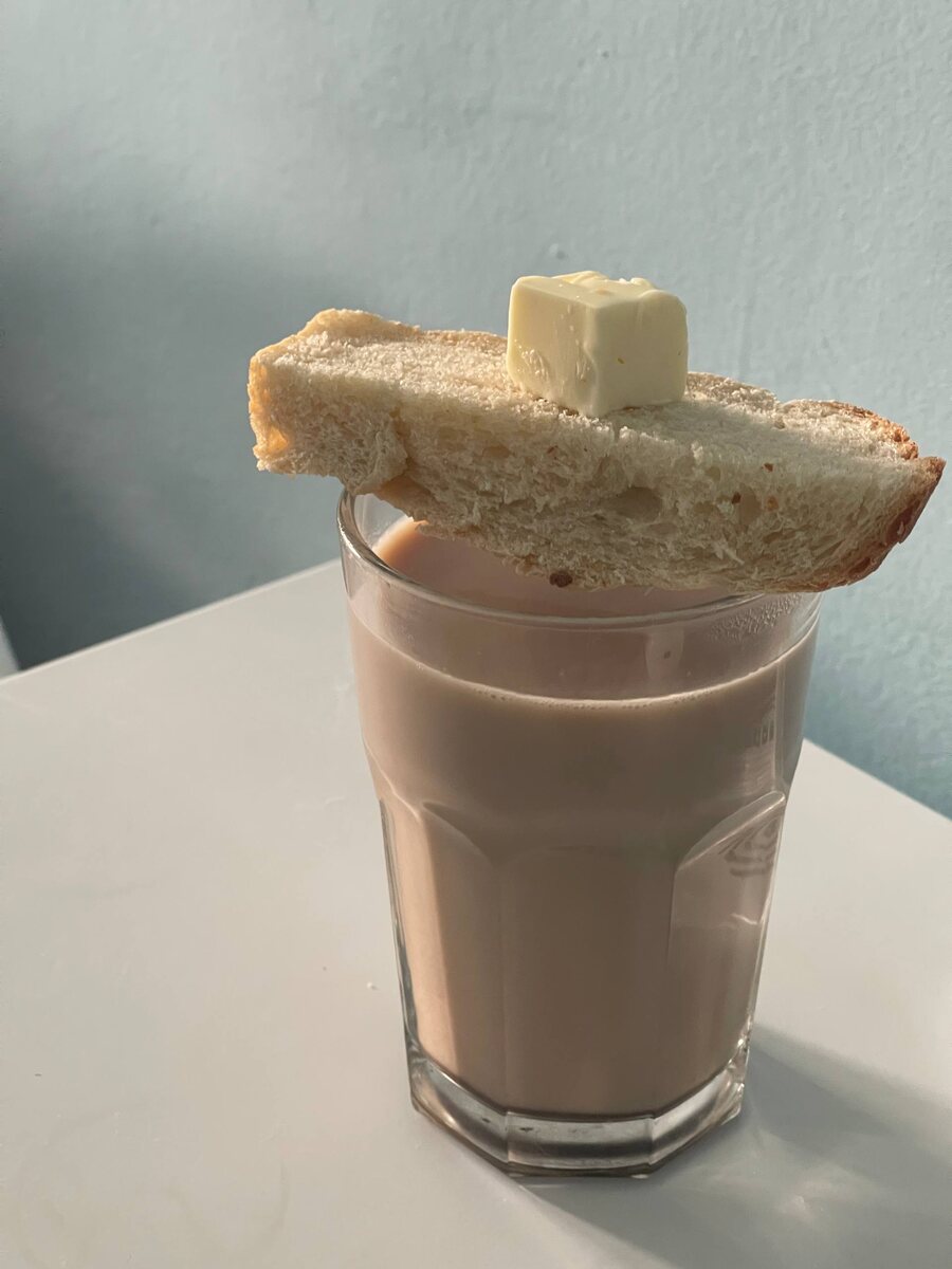 Завтрак пока такой, какао очень вкусное, не как в школьной столовой 😀 еще дали яйцо и манную кашу, съел из всего этого только кашу 🙂
