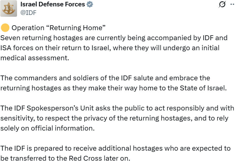 IDF 'medical' first for just-released hostages Israeli media reporting they seem in good condition