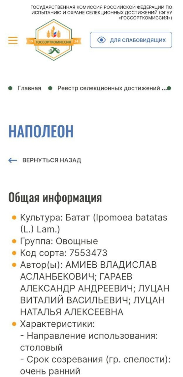 БАТАТ В РОСРЕЕСТРЕ: НОВЫЙ ЭТАП РАЗВИТИЯ РОССИЙСКОЙ СЕЛЕКЦИИ Включение батата в Государственный реестр селекционных достижений – важная веха в развитии отечественного сельского хозяйства. Этот шаг открывает новые перспективы для выращивания и реализации этой ценной культуры в России. Долгожданное признание на государственном уровне означает, что теперь батат может легально и широко использоваться в сельскохозяйственном производстве. Именно благодаря кропотливой работе селекционеров стал возможен этот прорыв. Наши сорта батата теперь официально признаны и защищены законом. В связи с этим, мы обращаемся ко всем, кто занимается реализацией наших сортов батата в интернете, с просьбой указывать авторство – "сорт от Луцан". Это несложное действие, тем не менее, имеет большое значение. Указывая авторство, вы не только соблюдаете закон, но и вносите свой вклад в популяризацию российского батата. Сегодня, когда рынок наводнен импортным продуктом, важно подчеркнуть, что в России тоже есть свои