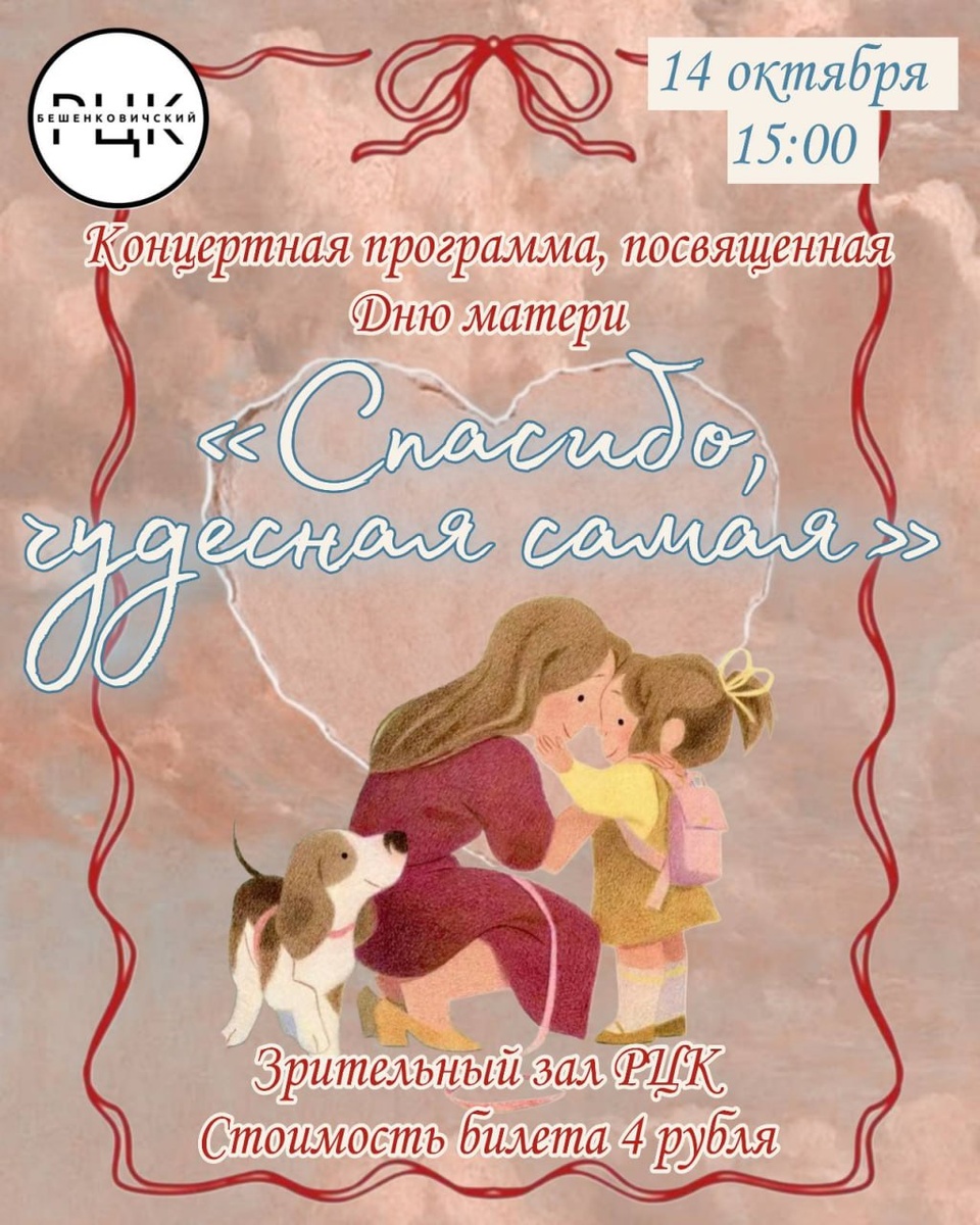 👩👧Концертную программу "Спасибо, чудесная моя!", посвященную Дню матери, готовят работники культуры ✨Праздничное мероприятие пройдет завтра, 14 октября, в районном центре культуры. 👉Начало — в 15 часов. Цена билета — 4 рубля.