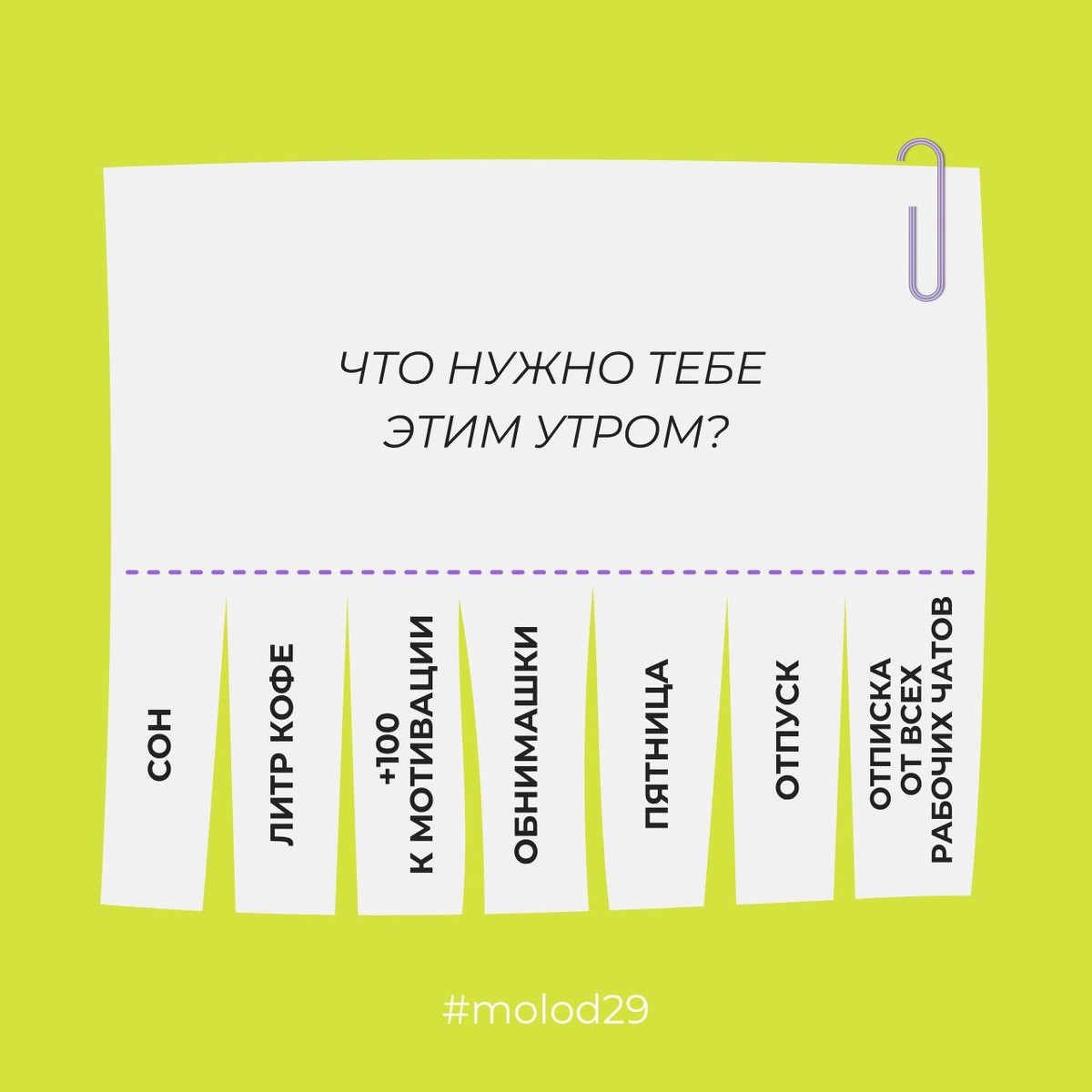 ⏰ Восемьдесят три процента всех дней в году начинаются одинаково: звенит будильник Осень может быть холодной, утро ранним, а задачи, на первый взгляд, невыполнимыми. Самое время взять кусочек мотивации и пожелать окружающим доброго утра! Всем удачной недели ✨ #molod29