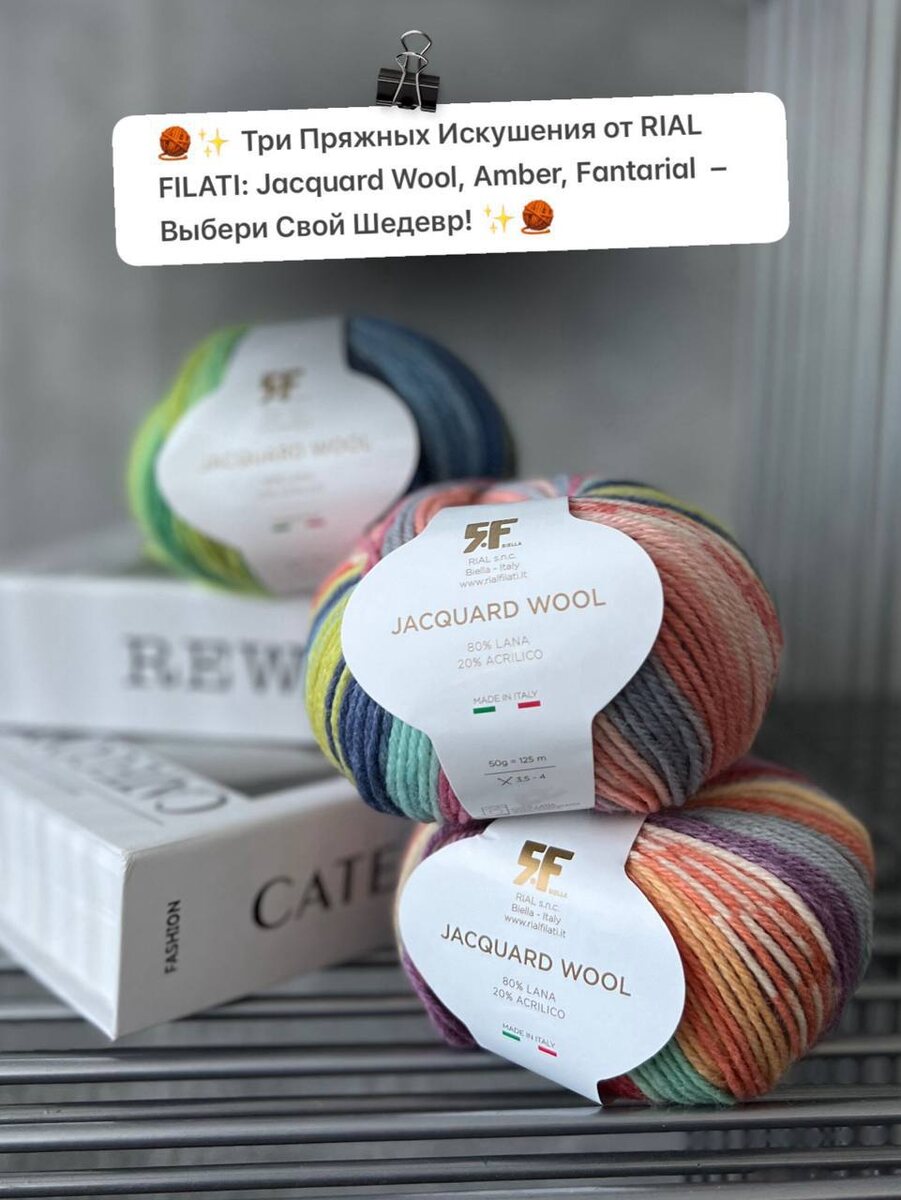🧶✨ Три Пряжных Искушения от RIAL FILATI: Jacquard Wool, Amber, Fantarial – Выбери Свой Шедевр! ✨🧶 Готовы ВЯЗАТЬ что-то по-настоящему особенное? ТОГДА ЭТОТ ПОСТ ДЛЯ ВАС! Сегодня в центре внимания три восхитительных артикула из коллекции RIAL FILATI: каждый из которых обладает своим неповторимым характером: Jacquard Wool: пряжа, которая «рисует» сама Линия из 10 принтованных цветов — жаккард-эффект появляется сам, без смены нити. Идеальна для носков, варежек, детских свитеров и тех, кто любит, когда пряжа «рисует» сама. ❤️ Пряжа праздник 🔥 - 80% шерсть 20% акрил - 125м/50г Окрашена коротким цветными секциями, интересная палитра и необыкновенные переходы. Идеально подойдёт для шапок, варежек, митенок, джемперов, кардиганов Amber: меринос с характером Идеален для свитеров и кардиганов, потому что он слишком хорош для простых шапок 🥰 - 100% pura lana merinos superwash - Метраж: 250м/100г 🌟 Fantarial: - настроение в каждом мотке. Плавные переходы цвета сами создадут неповтор