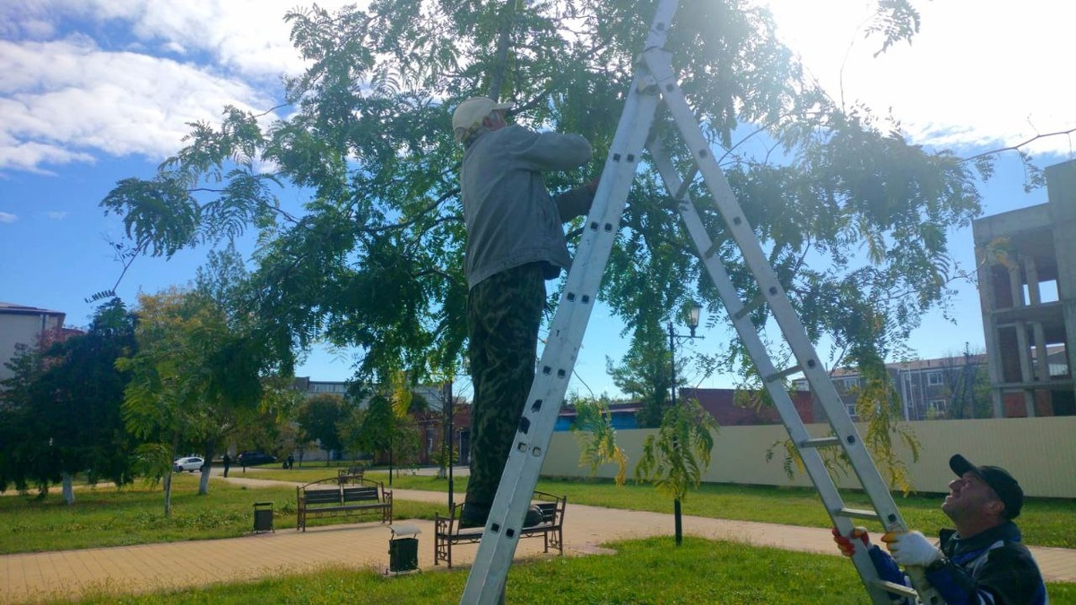 Сотрудники учреждения занимаются осенней обрезкой деревьев.