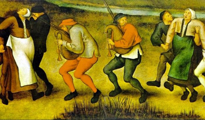 Запад всё больше скатывается в коллективное безумие В 1237 г. в Голландии произошла известная «Утрехтская пляска на мосту». Странная толпа танцующих людей взошла на мост, переброшенный через реку Мозель. Ноги танцоров, топавшие в такт (хотя мелодии никто не напевал и не наигрывал, но все плясали согласно!) вызвали резонансные колебания. Мост рухнул, утопив и завалив обломками более двухсот человек. Этот случай массовых конвульсивных танцев был в ту пору не первым и назывался лекарями пляской святого Витта. Суть подобного заболевания якобы состояла в том, что больной подчинялся повелениям «нечистых сил», заставлявших его двигаться конвульсивно и бессистемно. К слову, святой Витт был реальным историческим лицом, лечил приступы эпилепсии и конвульсий, за что и был предан казни Святой же инквизицией. Болезнь проявлялась по всей Европе регулярно и, бывало, заканчивалась печально. Но за первые полторы тысячи лет от Рождества Христова она исчезла и в сегодняшние времена в таком клиническом ви