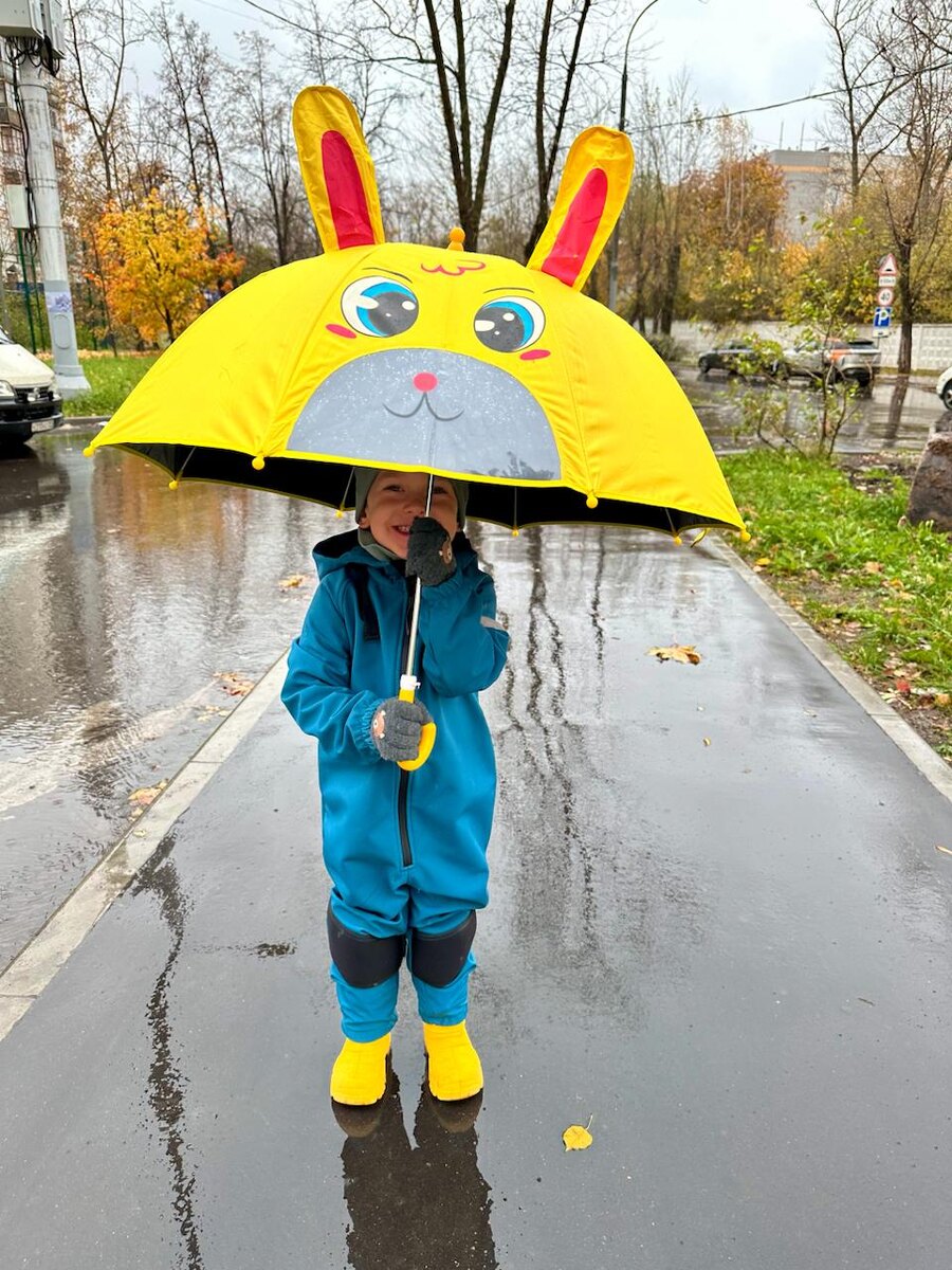 В Москву пришла настоящая дождливая осень. Это грустно, но я рада, что подготовилась в плане одежды Тима. Статья не является рекламой, ни к чему не призывает и выражает мой субъективный обзор в рамках постоянной рубрики с обзорами моих покупок. Хотела отложить покупку софтшелл-комбеза на весну, думала, ещё чуток походит в своём старом горчичного цвета. Но заметила, что ему неудобно ходить, штаны врезаются в попу. Сначала заказала красного цвета, но потом поняла, что он не подойдёт под другую одежду. Взяла синий (или это бирюзовый?). Комбез неплохой, реально не промокает, но узковат и нет карманов, а наколенники, которые мне собственной особенно понравились, расположены ниже колен. На Тиме размер 110, а рост у него 101 см. Купила за 3 595 рублей, сейчас стоит на 200 рублей дешевле. Артикул на озоне 542086659. Обувь я впервые заказала в интернет-магазине, на который была подписана в запретограме, но на маркетплейсах такие не нашла. Гибкая подошва, хорошая липучка и защищённые носы — идеа
