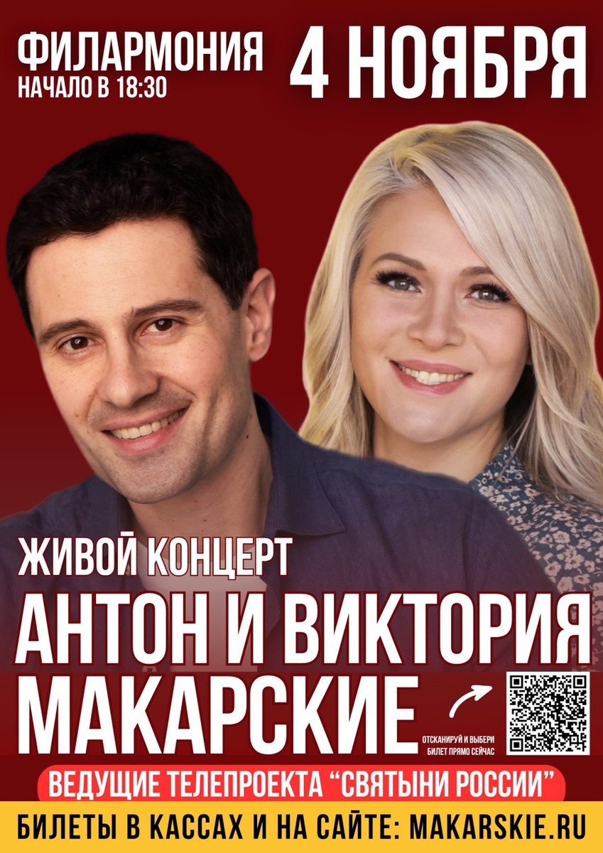 Приглашаем вас на «Живой Концерт» в стенах Владимирской областной филармонии. 4 ноября в 18:30 нас ждет «Живой Концерт» 🌟 знаменитых артистов и примерной православной семьи — Антона и Виктории Макарских. Ждем вас в гостеприимных стенах Владимирской областной филармонии! 🏛 Адрес: г. Владимир, пр-т Ленина, д. 1 (600001) Этот концерт — не просто выступление, а настоящее уникальное музыкальное действо, выходящее за рамки привычного формата! Вас ожидает: ✨ Живое общение: С первой минуты Антон и Виктория покоряют зал своим тонким юмором, невероятными голосами и непосредственным, тёплым общением с публикой. 🎵 Безупречный репертуар: Вас ждут самые красивые и любимые мелодии — от песен, написанных для дуэта такими авторами, как Дмитрий Хмелев, Ирина Дубцовой, Игорь Корнелюк, Максим Дунаевский, до легендарных советских хитов. Виртуозные музыканты: Всё звучит только вживую 🎹🎸 в сопровождении талантливых инструменталистов. Никакой фонограммы! Интерактивность: Концерт называется «Живым