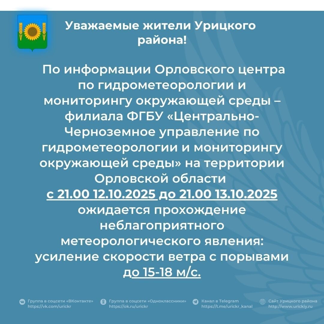 ❗По информации Орловского центра по гидрометеорологии и мониторингу окружающей среды – филиала ФГБУ «Центрально-Черноземное управление по гидрометеорологии и мониторингу окружающей среды» на территории Орловской области с 21.00 12.10.2025 до 21.00 13.10.2025 ожидается прохождение неблагоприятного метеорологического явления: усиление скорости ветра с порывами до 15-18 м/с.