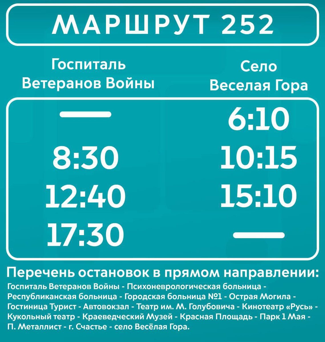 🚌 «Луганскгортранс» открыл новый автобусный маршрут №252 Он соединяет село Весёлая Гора с Госпиталем ветеранов войны в Луганске. ➡️ Маршрут будет работать на регулярной основе в соответствии с установленным расписанием Подписаться | Наш чат
