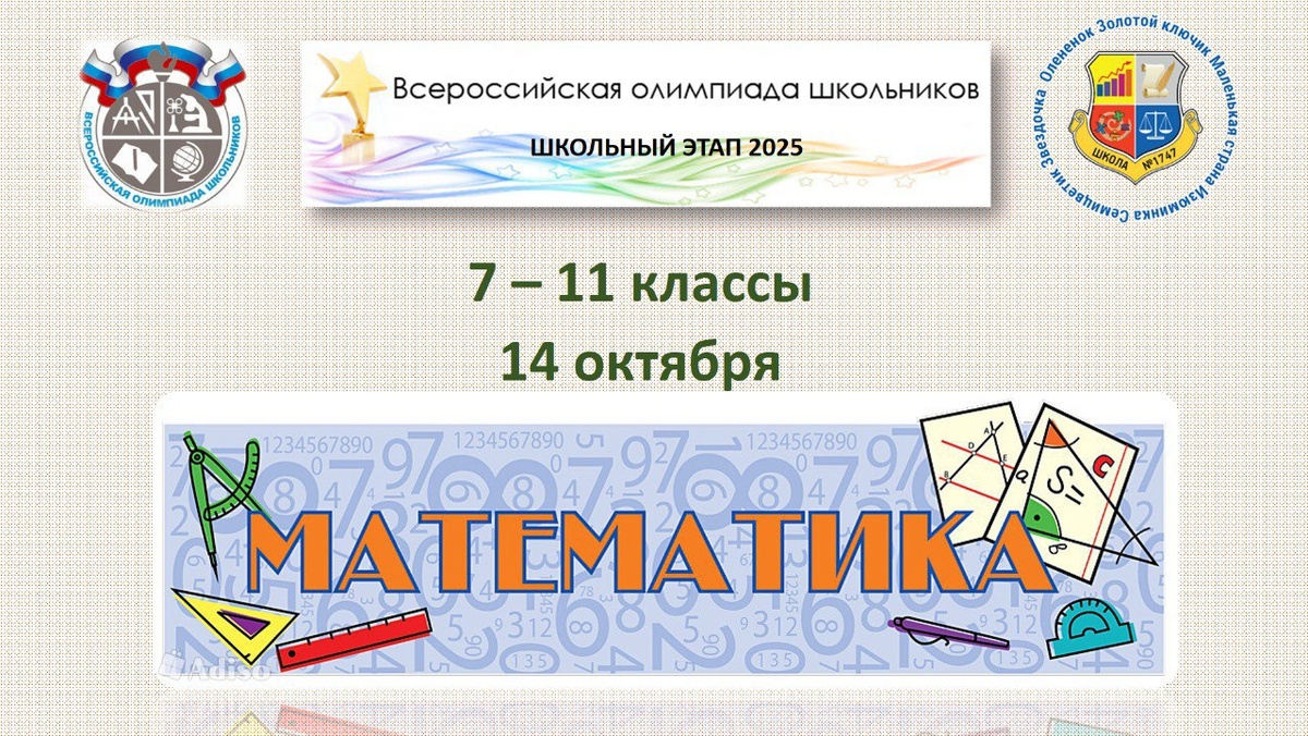Дорогие ребята! 🤗 Приглашаем вас принять участие (14 октября 7-11 классы) в школьном этапе олимпиады по математике. С 22 сентября 2025 года до особого распоряжения оргкомитета школьный этап всероссийской олимпиады будет проходить в резервной тестирующей системе https://online.olimpiada.ru/ . Для участия в турах школьникам необходимо получить индивидуальные коды в своей школе. С заданиями прошлых лет можете ознакомиться на сайте: https: //vos.olimpiada.ru/archive/table/tasks/years/2024_2025 Памятка для участника: https://vos.olimpiada.ru/2025/school/memo Желаем удачи! 💐 #ДОНМ #ШколыКолледжиМосквы #Школа1747