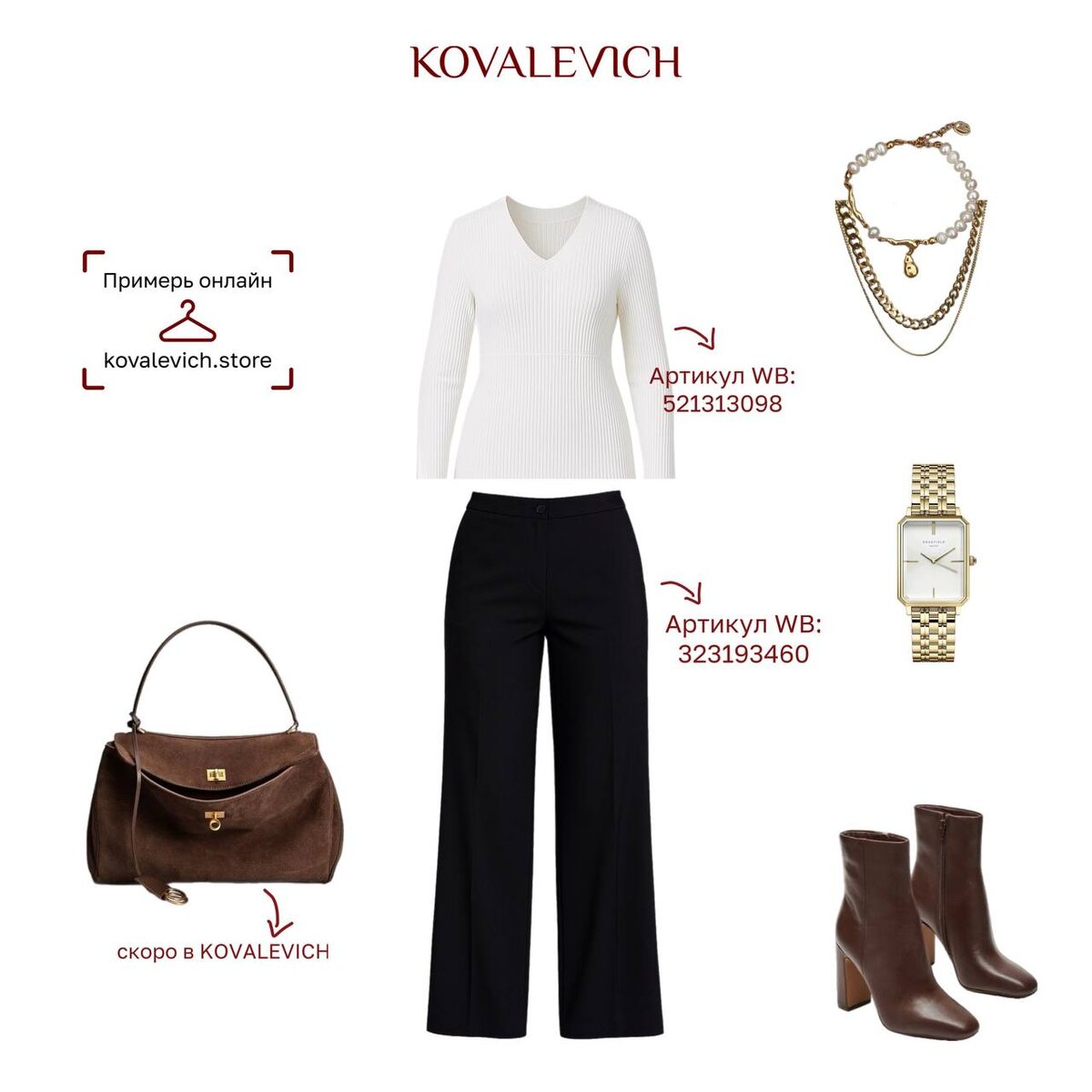 Начнем неделю с базового образа для работы?🔥 Простая формула современного образа: 🤩Брюки, которые визуально вытянут ноги и сделают их стройнее. 🤩Джемпер, который подчеркнет силуэт благодаря правильным линиям. 🤩Добавим аксессуары, чтобы сделать образ более заметным. 🤩Идеально будет, если сверху накинуть куртку KOVALEVICH. Красотки, делитесь, как вам образ?