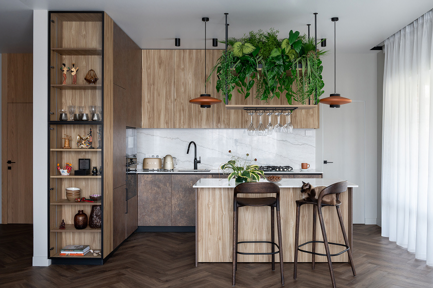 Елена Кольцова создала интерьер дома для молодой пары, которые любят путешествовать по Африке. «На выбор цветовой палитры меня натолкнула совместная фотография заказчиков из их путешествия в Африку и пожелание заказчицы видеть интерьер в теплых тонах», — отмечает автор проекта. В интерьере присутствуют мягкие оттенки коричневого и припыленного теплого серого, с примесью зеленого тона в холле, гостиной, детской и красного тона в спальне и гардеробной. Основная отделка стен в помещениях — краска нейтрального цвета. Однако дизайнер активно использовала акцентные фактурные материалы. В прихожей это шпонированные двери с панелями, делающими их визуально выше и, соответственно, увеличивающими и высоту потолка. В спальне — сложная отделка стены в изголовье кровати: комбинация шпонированных панелей с рисунком «елочка» и полиуретановых панелей, окрашенных в цвет стен. Автор проекта: Елена Кольцова Стилист: Галина Андреева Фотограф: Ольга Акинина Изделия: Двери Base 1 с панелями Komplanar, шпон