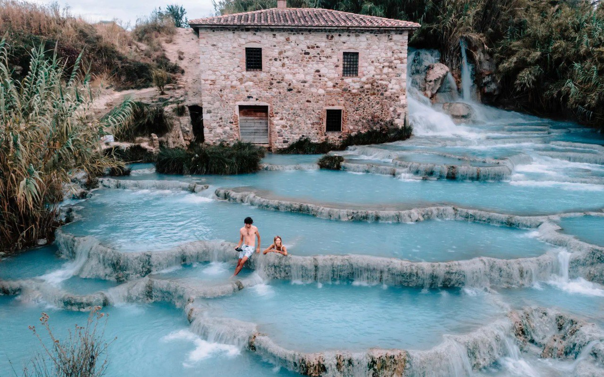 💎 Главное место силы курорта — бассейн-кратер у подножия отеля Terme di Saturnia Spa & Golf Resort 5*. Здесь вода обновляется каждые 4 часа, поддерживая естественную температуру +37,5 ºС.